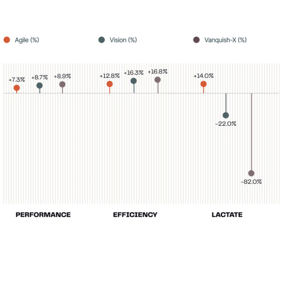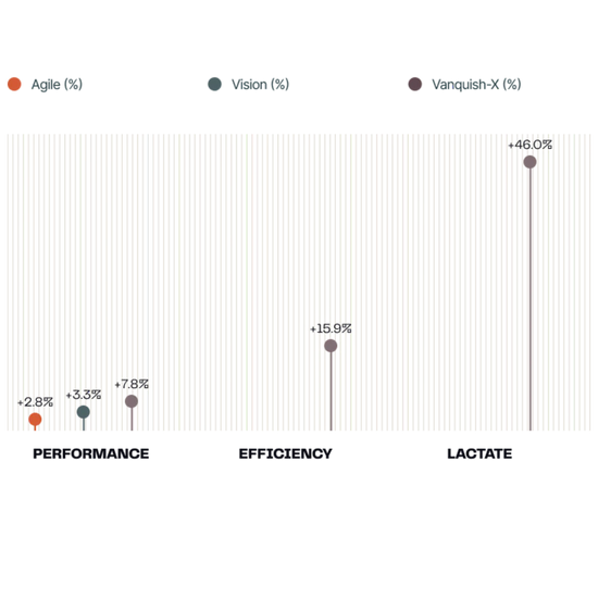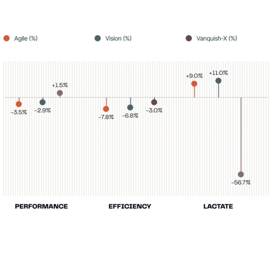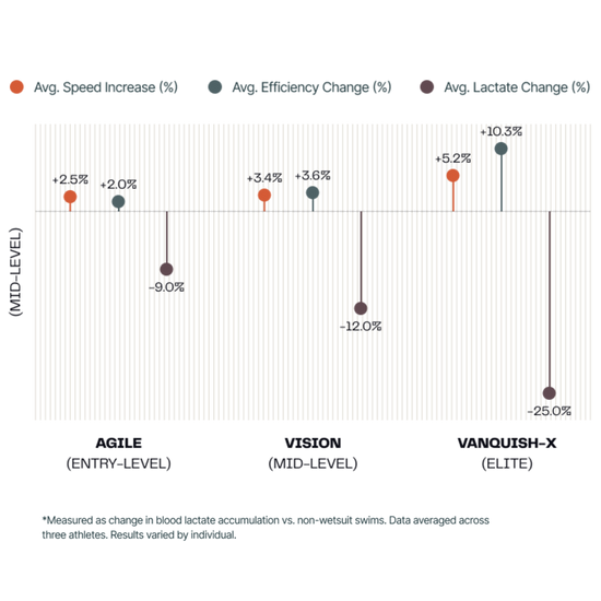 Performance benefits scaled with wetsuit tier, with the Vanquish-X delivering the largest gains.